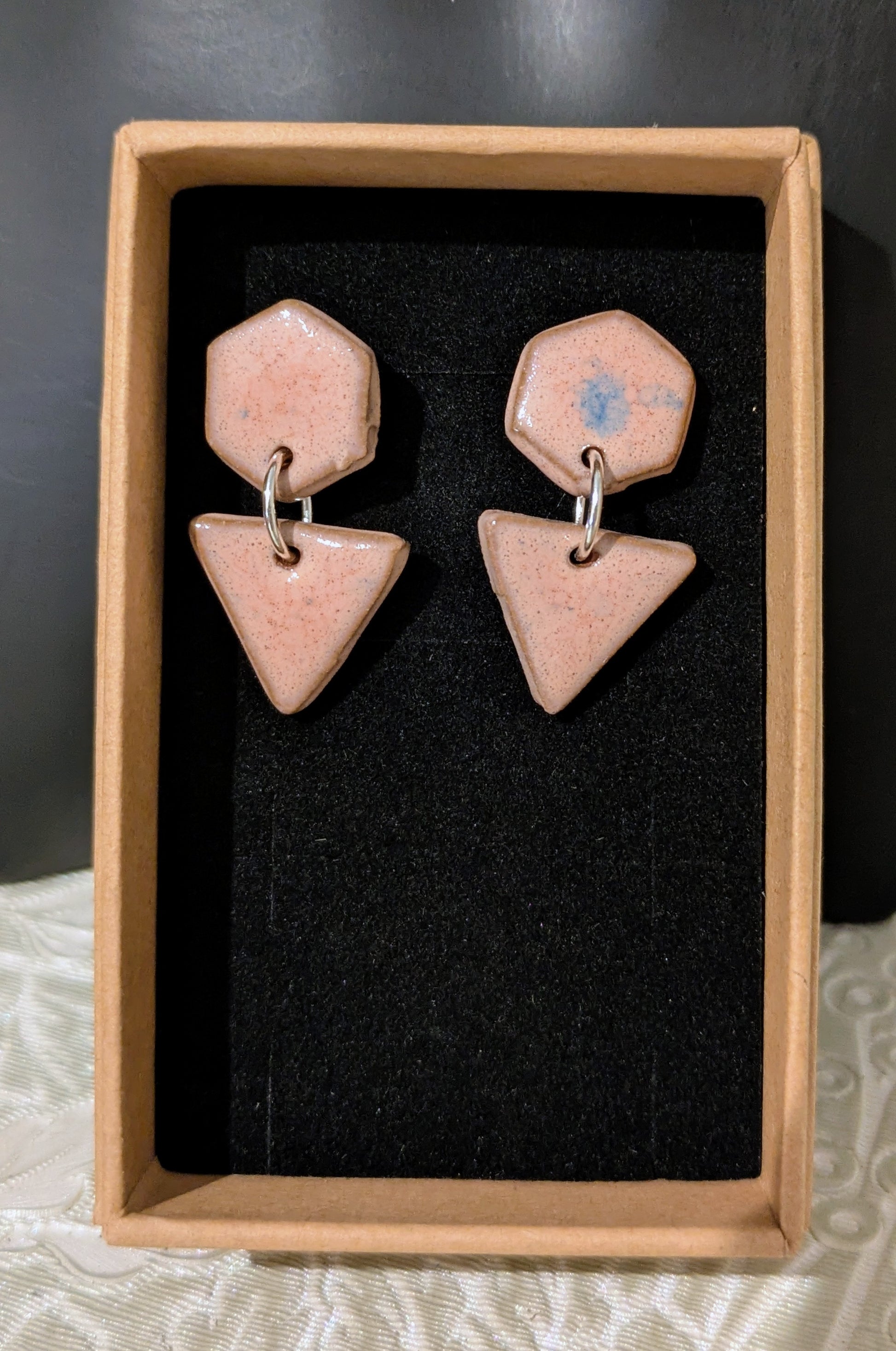 These gorgeous blush pink with a hint of blue drop ceramic earrings are handmade from earthenware clay, cut, shaped, glazed and fired in the kiln.
