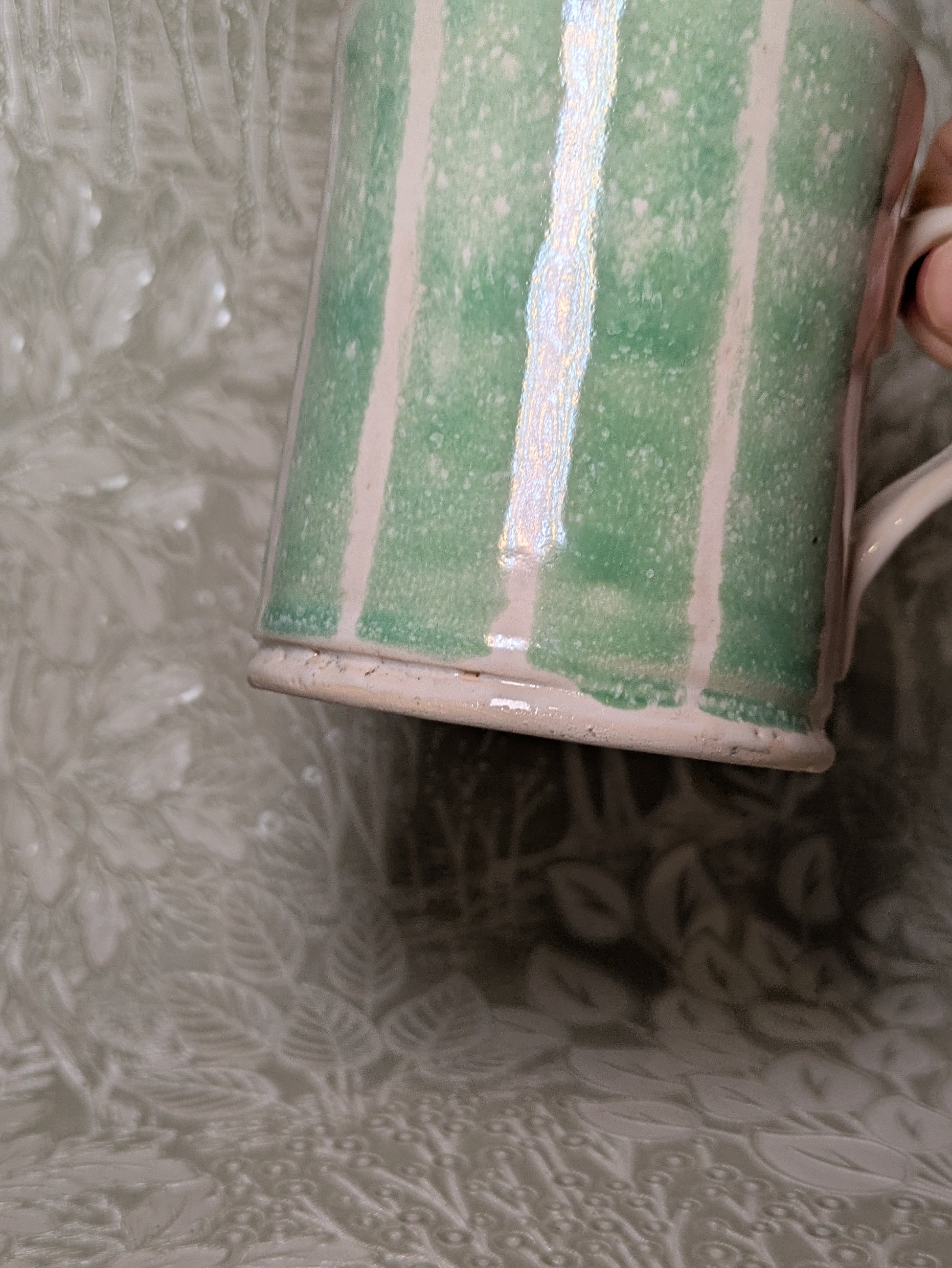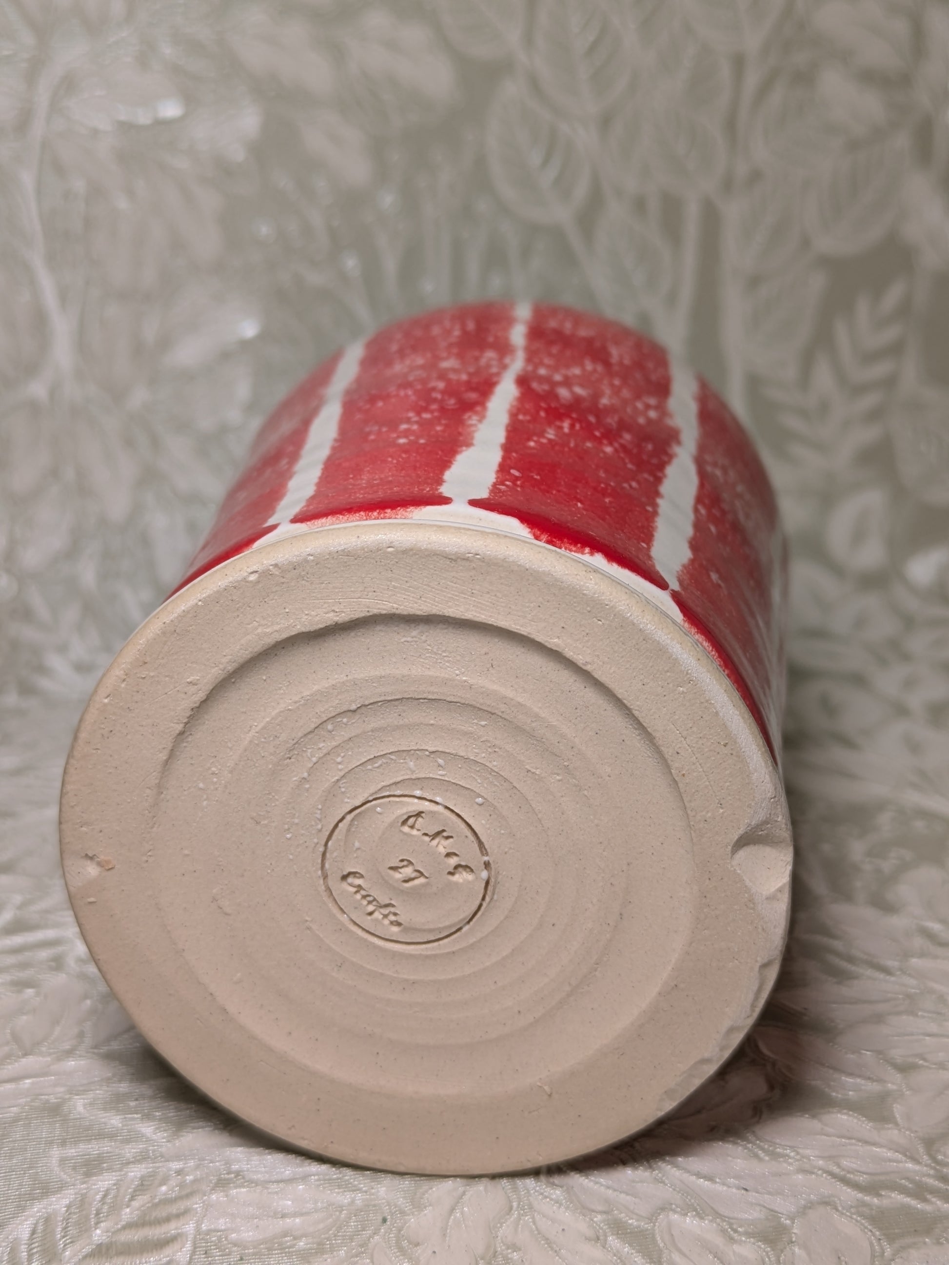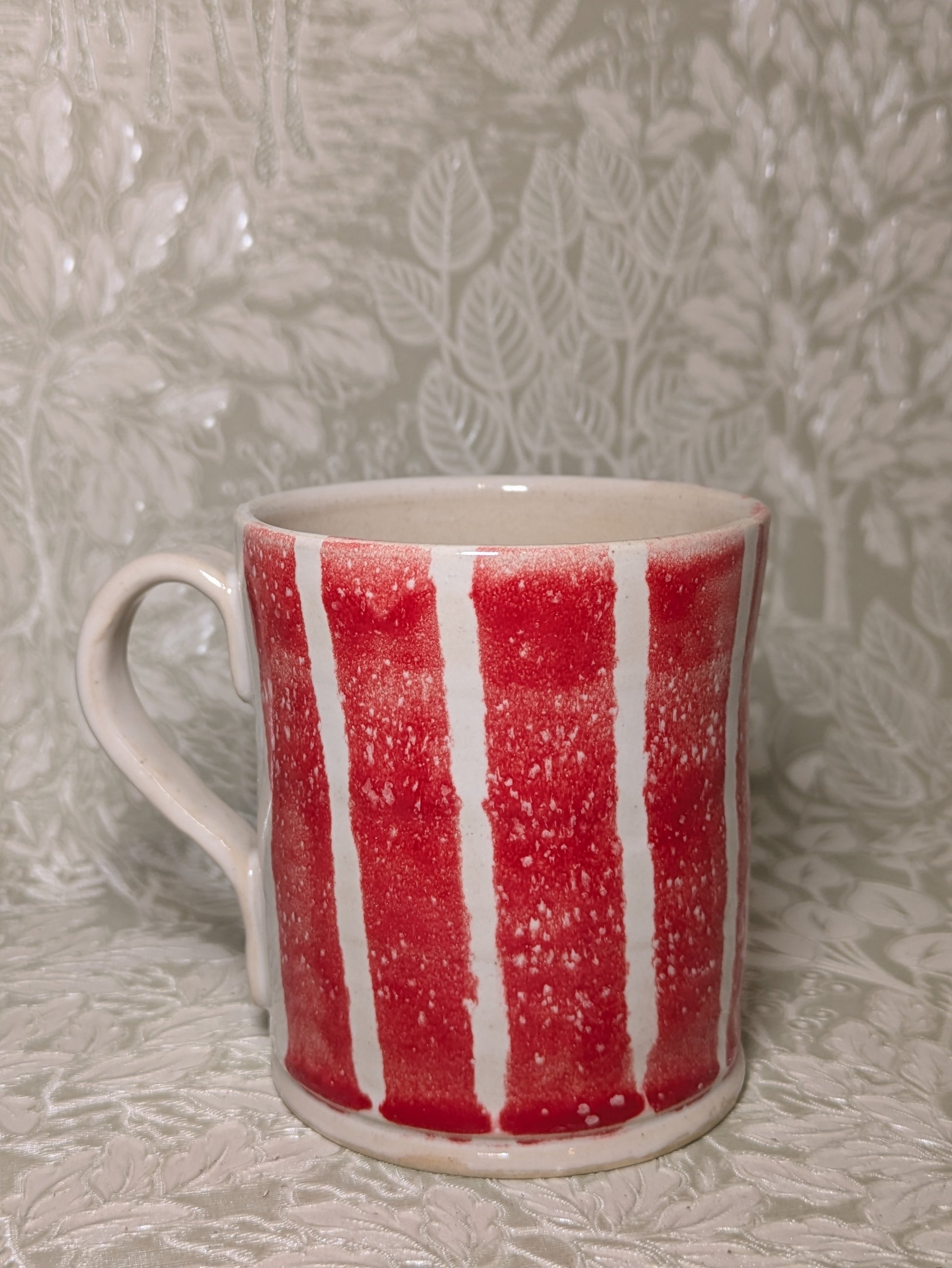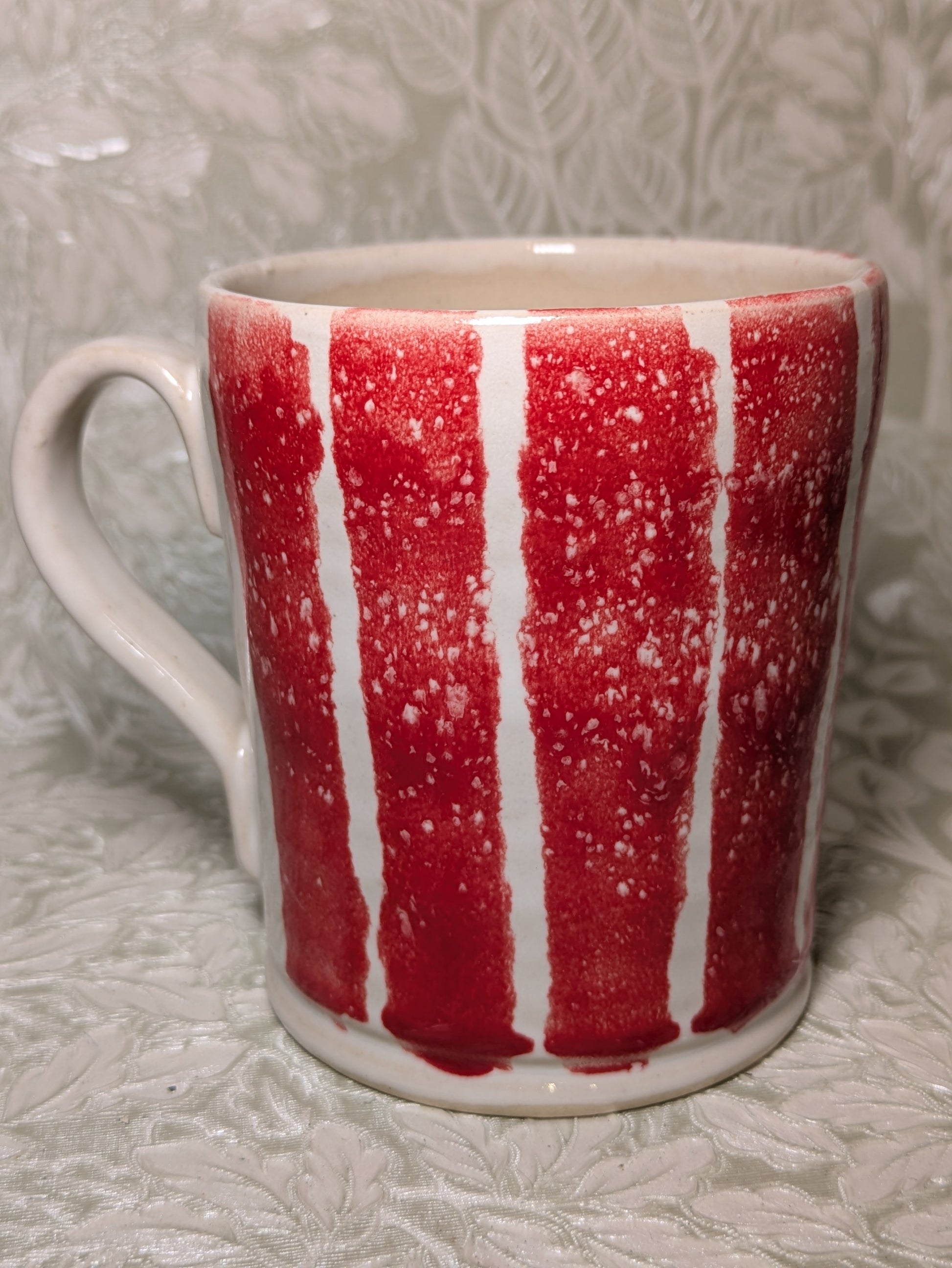 Candy Cane striped mugs. These are seconds, which means that each one has a slight aesthetic flaw either on the base or on the outer glaze.